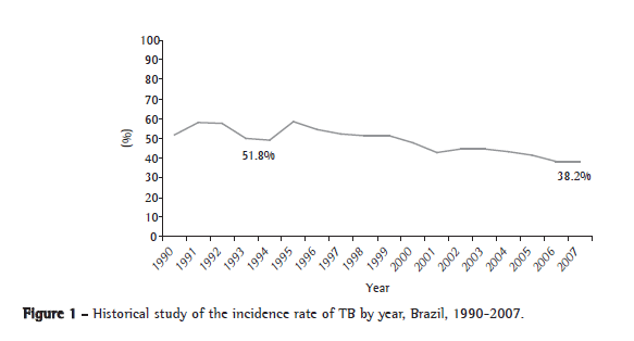 The United Nations Millennium Development Goals for Tuberculosis (TB) are aimed at effecting a 50% reduction in the rates of TB incidence and mortality by 2015. Brazil continues to be one of the 22 countries that, together, account for 90% of all TB cases worldwide. However, as of 2007, there had been a 26% decrease in incidence and a 32% decrease in mortality in our country. This decrease has become accentuated since the implementation of the DOTS strategy in 1999. The incidence rate of TB in Brazil during this period is presented in Figure 1.
