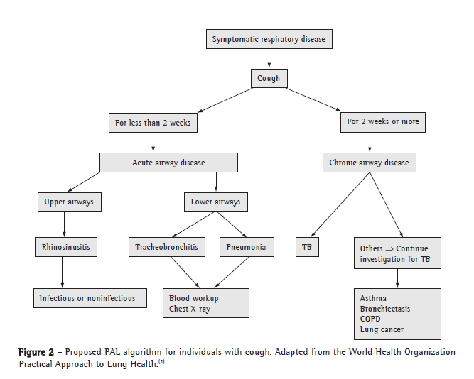 Although cases of pulmonary TB usually present as cases of SRD, pulmonary TB accounts for only 1.4-3.0% of the total number of cases of SRD treated at health care facilities, and, therefore, the WHO suggests that the approach to cases of SRD be systematized and include the investigation of other diseases, such as acute respiratory infection, asthma, and COPD, in addition to TB.(1[2A]) This strategy, known as PAL, aims to strengthen health care systems by linking TB control activities and health care facilities.(2) For the purpose of surveillance of cases of pulmonary TB, cases of SRD will be defined as those in which individuals have cough, since cough is the most common symptom of pulmonary TB. Figure 2 presents a proposed algorithm for implementing the PAL strategy.