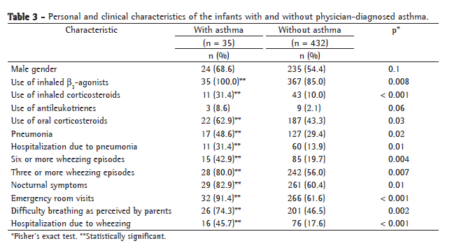 Physician-diagnosed asthma was reported for 35 (7.5%) of the 467 wheezing infants. Table 3 shows the comparison of the clinical characteristics of the infants with and without physician-diagnosed asthma. The multivariate analysis revealed that physician-diagnosed asthma was independently associated with the use of inhaled corticosteroids (OR = 2.97; 95% CI: 1.32-6.69; p = 0.009), difficulty breathing during the attacks (OR = 4.42; 95% CI: 1.30‑14.5; p = 0.02), and having had six or more wheezing episodes (OR = 2.15; 95% CI: 1.02-4.52; p = 0.04).