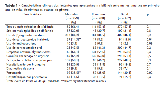 Entre os sibilantes, houve predomínio de lactentes do gênero masculino, que também apresentaram maior frequência de episódios de pneumonia e utilizaram corticosteroide inalatório mais frequentemente para o tratamento da sibilância do que as meninas (Tabela 1). Estudos já demonstraram que o sexo masculino é um fator de risco para sibilância na infância, e aponta-se o menor calibre das vias aéreas dos meninos ao nascimento como uma possível explicação para esse fato.(1)