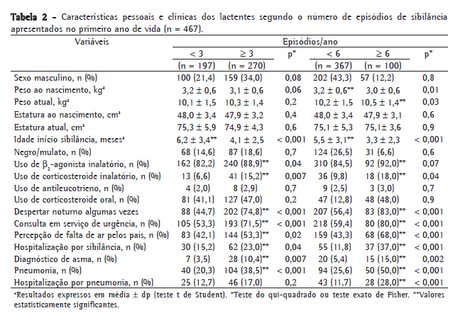Observamos um ou mais episódios de sibilância nos primeiros 12 meses de vida em 467 (46,0%) lactentes, com média de início aos 5,0 ± 3,0 meses. Apresentaram três ou mais episódios de sibilância (sibilância recorrente) 270 lactentes (26,6%), enquanto 100 lactentes manifestaram seis ou mais episódios de sibilância (sibilância recorrente grave). A Tabela 2 apresenta as características pessoais e clínicas de cada grupo de sibilantes.