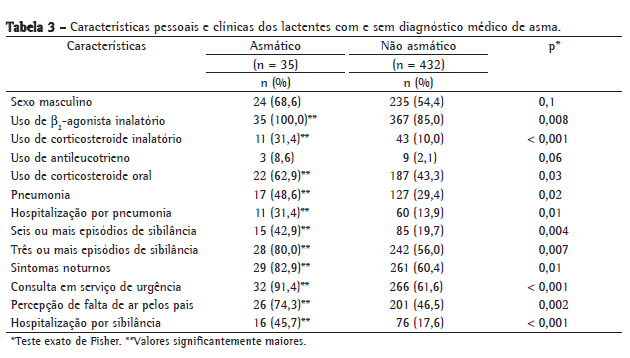 Os pais de 35 lactentes (7,5%) referiam conhecimento do diagnóstico médico de asma. A comparação entre as características clínicas dos asmáticos e dos demais sibilantes encontra-se na Tabela 3. Pela análise multivariada, identificamos associações independentes do diagnóstico de asma com o uso de corticosteroide inalatório (OR = 2,97; IC95%: 1,32-6,69; p = 0,009), falta de ar durante a crise (OR = 4,42; IC95%: 1,30‑14,95; p = 0,02) e ter tido seis ou mais episódios de sibilância (OR = 2,15; IC95%: 1,02‑4,52; p = 0,04).