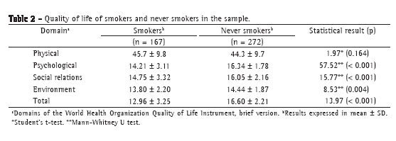 In the present study, the mean scores in the four domains of the WHOQoL-BREF (physical, psychological, social relations and environment) were lower in smokers than in never smokers. These results are consistent with those obtained by another author,(3) who evaluated the association between QoL and the severity of tobacco dependence and reported an association between the severity of tobacco dependence and lower scores in all WHOQoL-BREF domains.