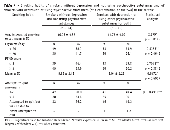 In the present study, there were no significant differences, in terms of the number of cigarettes consumed per day, between smokers who used psychoactive substances other than tobacco or presented with depression (or a combination of the two) and smokers who did not use psychoactive substances or present with depression. One group of authors,(24) however, showed that smokers with fewer depressive symptoms smoked less than one pack of cigarettes per week, whereas those with many depressive symptoms smoked more than two packs of cigarettes per week.