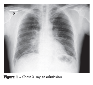 In the previous week, the patient had developed the flu, characterized by fever (38.5°C), generalized pain, rhinorrhea and nasal obstruction. Three days later, he began to present extreme fatigue and malaise and sought treatment in the emergency room, where he was submitted to chest X-ray and was diagnosed with pneumonia. On that same date, the blood workup revealed the following: hemoglobin, 14.8 g/dL; hematocrit, 41.9%; leukocytes, 4,600/mm3 (3-85-0-0-11-1); platelet count, 132,000/mm3; and ESR, 16 mm/h. The patient was treated with oral moxifloxacin and was instructed to return if his condition worsened. Since the patient felt increasingly tired, he returned to the emergency room two days later. He reported no contact with suspected cases of infection with influenza A (H1N1) virus.