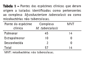 Os resultados da identificação fenotípica e genotípica realizada em nosso estudo indicam que, no período do estudo, não foram obtidos isolados de M. bovis. Esse resultado parece surpreendente porque a tuberculose bovina ainda é prevalente em nosso país. Em 2004, um estudo com 454.108 animais mostrou uma prevalência que variou de 0,37% no sudeste a 3,62% no norte.(6) Em um estudo realizado no estado do Rio de Janeiro,(15) 12,7% dos bezerros leiteiros mostraram reatividade ao teste cutâneo de puntura.