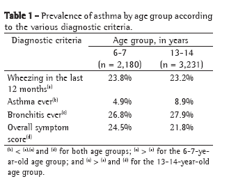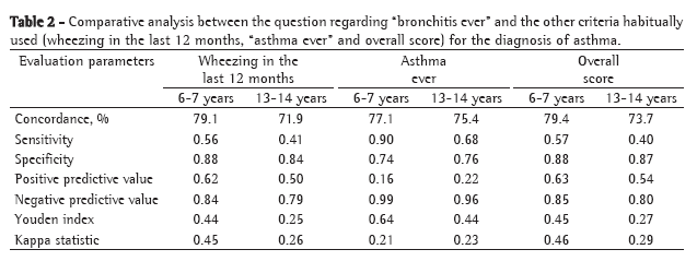 Another noteworthy finding of the present study was the confirmation that it is difficult to obtain a simple criterion for the diagnosis of asthma in a written questionnaire. The degree of concordance between the different criteria assessed was, in general, quite low (Table 3). This lack of consistency was evidenced by the great difference between the question regarding "asthma ever" and the other criteria in terms of the prevalence of asthma obtained. This same inconsistency was observed between criteria with similar prevalence, such as the questions regarding "bronchitis ever" and wheezing in the last 12 months. For both age groups, a high degree of concordance was observed only between the overall score and the question regarding wheezing in the last 12 months (Table 3), which supports the recommendation that these criteria be used for the diagnosis of asthma. It is of note that the question regarding wheezing in the last 12 months is already included in the ISAAC questionnaire, and greater concordance between this question and the overall score was therefore expected. However, the question regarding wheezing in the last 12 months does not necessarily indicate a positive or a negative overall score. This question accounts for only one third (or two fifths) of the overall score. The overall score allows the diagnosis of asthma in children with more uncommon presentations, in which wheezing is not so evident or easily identified.
