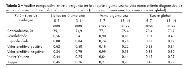 A análise comparativa entre a resposta à questão "teve bronquite alguma vez" e os demais critérios diagnósticos de asma mostrou níveis de concordância que oscilaram entre 71,9% e 79,4%, com tendência a valores mais altos entre os escolares (Tabela 2). Todavia, os coeficientes de sensibilidade e de especificidade, os valores preditivos positivo e negativo, o índice de Youden e o coeficiente de concordância de kappa mostraram-se baixos (Tabela 2).