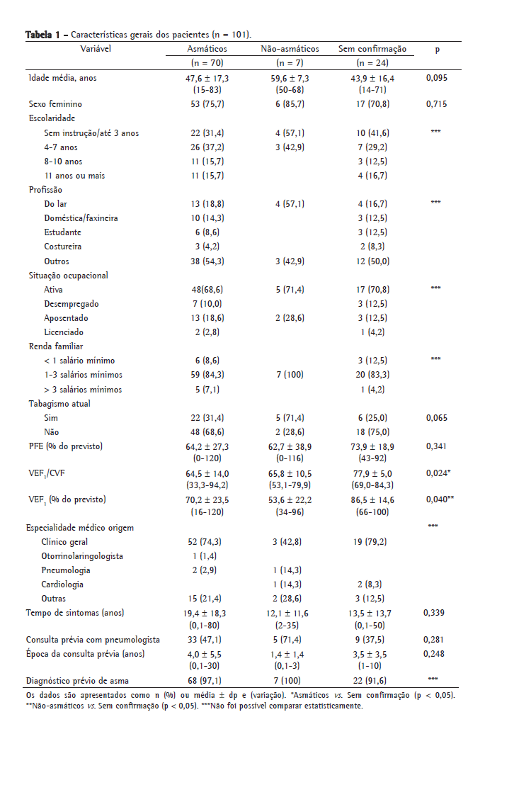 A amostra constituiu-se de 102 pacientes, sendo que 70 (68,6%) foram confirmados como asmáticos e 7 (6,9%) tiveram outros diagnósticos. Dos 102 pacientes, 24 (23,5%) não retornaram para as consultas subsequentes até o término do estudo, os quais foram denominados "sem confirmação"; 1 paciente não completou o questionário e foi excluído do estudo. A idade média dos asmáticos foi de 47,6 anos, sendo a maioria de baixa escolaridade e com renda familiar inferior a três salários mínimos (Tabela 1).