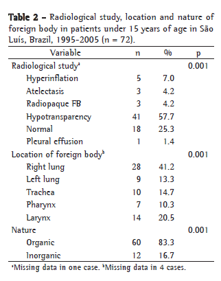 This difference was statistically significant (p < 0.001). As can be seen in Table 1, the following factors were also relevant: age under three years (in 81.9%; p < 0.001); male gender (in 63.9%; p = 0.025); > 24 h elapsed between the episode of aspiration and the definite diagnosis (in 66.7%; p < 0.001); and residence in outlying city (in 55.6%; p = 0.003). The signs and symptoms most frequently observed were dyspnea, cough and diffuse crackles (in 77.8%, 61.1% and 43.5%, respectively; data not shown in tables).