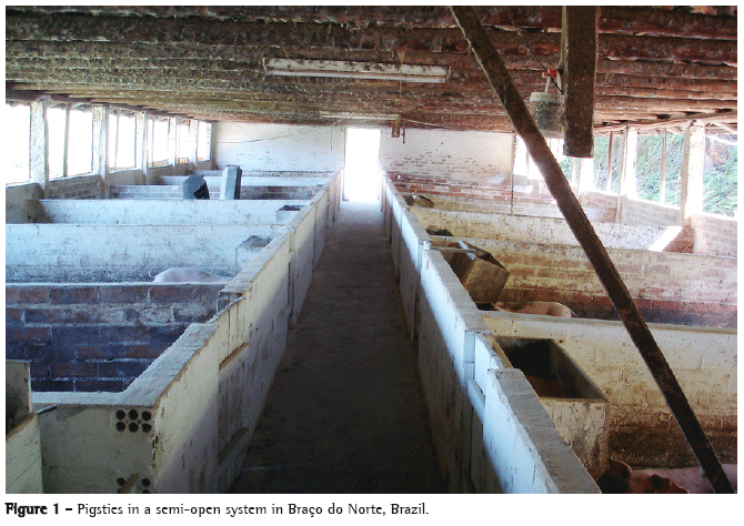 The prevalence of chronic bronchitis found among pig farmers was 5.1%. This finding is slightly lower than the values found in pig farmers over 40 years of age in other countries.(6,8) One factor that might explain this lower prevalence is the fact that pig farming in Brazil occurs in a different environment from that described in the international literature, especially in the countries with low temperatures where, for that reason, the system involves closed environments. Another important factor to be discussed is the fact that we did not exclude the individuals who reported clinical history consistent with the diagnosis of chronic bronchitis whose spirometry values did not reveal airflow obstruction. The use of the FEV1/FVCratio as the functional criterion led to a diagnosis of this disease in only two individuals. One group of authors(20) drew attention to those asymptomatic pig farmers who presented spirometric alterations, demonstrating greater sensitivity when this method was used for detecting cases. Great variations in the prevalence of respiratory signs and symptoms and of the diagnosis of respiratory diseases(16,18,19) might be explained by different profiles of the various systems employed in raising the animals, as well as by the different diagnostic criteria applied. In the international literature, we found that 96% of the farms are closed, with appropriate ventilation and built with concrete and metal.(6) This is in contrast with the semi-open farm system with natural ventilation found in Braço do Norte (Figure 1). Climatic, and possibly economic, differences explain the contrasts observed in the environment and in the results found.(11) Very closed pigsties, found in the colder climates, cause a greater concentration of exposure to pollutants. The mean work time spent in the pigsties was similar to that found in the literature,(18) and the length of employment presented exactly the same mean as that reported by some other authors.(19) In the same context, in Braço do Norte the confirmation of the acute symptoms (69%) also demonstrates the regional and environmental characteristics influencing the outcomes. Age did not influence the appearance of respiratory signs and symptoms. Low educational levels increased the chance of the disease by more than 50% among pig farmers, even after adjusting for age and smoking effects. Smoking, in addition to being a factor that increased the risk of developing respiratory manifestations and disease by nearly four times among the pig farmers studied, might have presented an additive effect on the manifestation of chronic symptoms, as previously described by other authors.(1,8,22,23) However, in the pig farmers of Braço do Norte, no significant difference was found between smokers and nonsmokers in the prevalence of chronic bronchitis. Various studies have demonstrated that the prevalence of these manifestations is higher among pig farmers than among workers engaged in other agricultural activities.(5,7,9) However, in the present study, the prevalence of chronic bronchitis among those who also engaged in other agricultural activities was approximately 7%, a much lower rate than that found in other studies.(17,18)