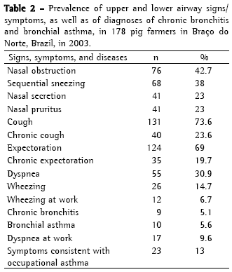 Among the pig farmers in Braço do Norte, the prevalence of respiratory manifestations was 84.3%, whereas this rate has varied from 22.6 to 82% in other studies.(2-4) In the population of Brazilian farmers as a whole, this information is not available. However, among European farmers, regardless of the type of activity, the prevalence of respiratory symptoms is approximately 22.1%.(15)