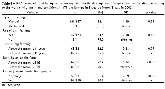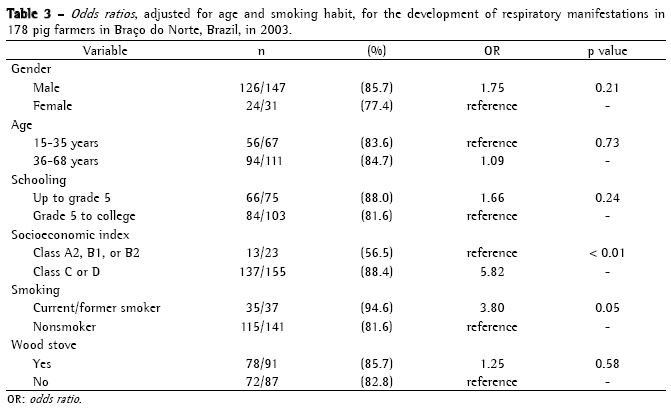 When exploring the prevalence of respiratory manifestations according to sociodemographic characteristics (Table 3), we found that the chance of such manifestations increased by more than 50% (OR > 1.5) in the pig farmers with lower levels of education, and that the chance of presenting respiratory signs and symptoms was also greater in this less privileged class. Among the smokers and former smokers we found that the chance of respiratory manifestations was four times greater (OR = 3.8; p < 0.05) than among the other pig farmers. In the same group, we found a 40% greater chance of presenting cough and a 20% greater chance of expectoration. The pig farmers who used wood-burning stoves had a 25% greater chance of presenting respiratory manifestations when compared to those who did not use such stoves. The prevalence of chronic bronchitis was twice as high among those who used wood-burning stoves.