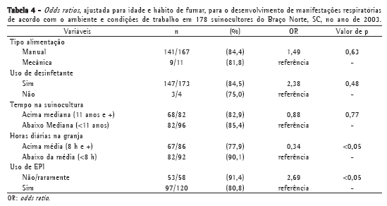 Concluindo, o evidente comprometimento do aparelho respiratório entre os suinocultores e a baixa adoção de medidas de proteção específica nesta população apontam para a necessidade de um programa de controle da exposição e regulamentação dos fatores ambientais em Braço do Norte, SC. O fenômeno saúde do trabalhador pode explicar a aparente associação entre tempo e intensidade de trabalho.