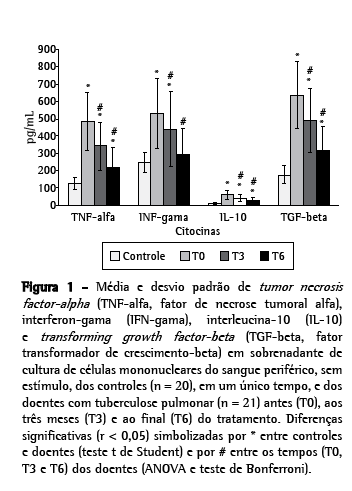 Embora se reconheça o papel importante do IFN-γ na formação do granuloma induzido pelo M. tuberculosis, os resultados dos estudos do comportamento dessa citocina nos doentes não são homogêneos. Essas discordâncias se devem a diferenças na metodologia utilizada nos trabalhos ou aos momentos evolutivos da doença em que a citocina foi quantificada. Alguns estudos ainda têm demonstrado relação entre a produção de certas citocinas e a gravidade da doença.(20-23)