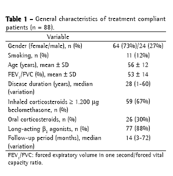 A total of 111 patients were included: 88 were considered treatment compliant, and 23 were considered noncompliant with treatment. There was no difference between the two groups regarding gender, age, FEV1/FVC ratio and disease duration. The female gender prevailed in both groups (73% in the noncompliant group and 72% in the compliant group). Mean age was similar (53 ± 11 years in the noncompliant group and 56 ± 14 years in the compliant group), and there were no statistical differences between the two groups in terms of mean FEV1/FVC ratio (47 ± 11 vs. 53 ± 14, p = 0.07). As expected, we observed a significant difference between the compliant and noncompliant group regarding control criteria.