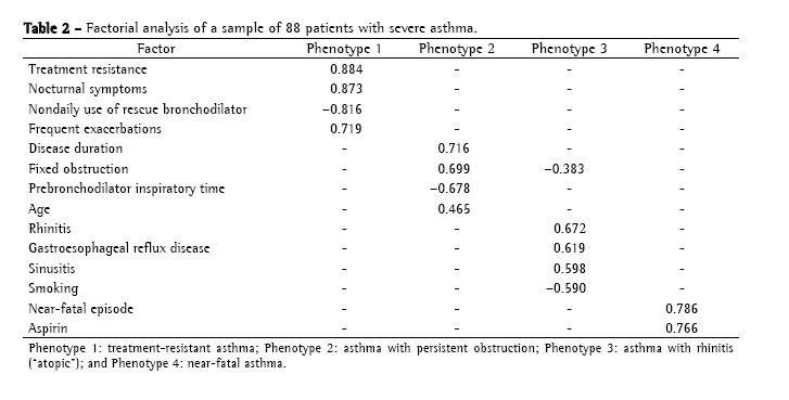 The factorial analysis (Table 2) identified four distinct phenotypes: phenotype 1 (n = 28) comprised patients who were treatment-resistant, more often presenting nocturnal symptoms and exacerbations, as well as more often using rescue bronchodilators; phenotype 2 (n = 48) comprised patients with persistent airflow limitation, lower FEV1/FVC ratios in the initial evaluation, more advanced age and longer duration of the disease; phenotype 3 (n = 42) comprised patients with allergic rhinosinusitis who were nonsmokers and presented predominantly reversible airflow obstruction (this group was denominated atopic asthma); and phenotype 4 (n = 15) comprised patients with aspirin intolerance associated with near-fatal asthma episodes.