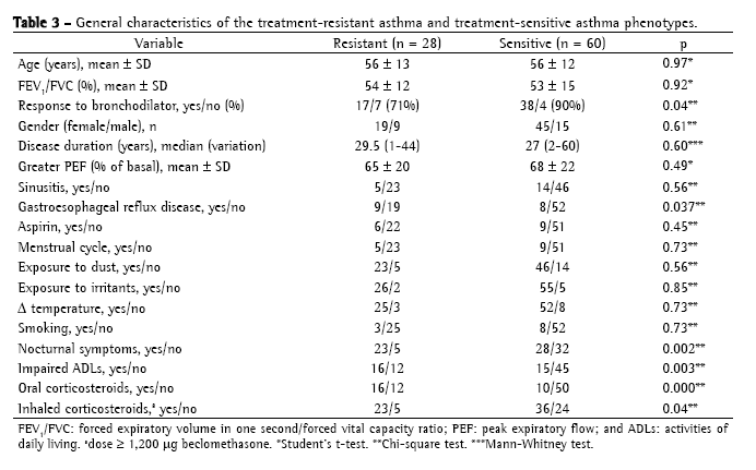 Compared with the other patients, treatment-resistant patients presented general characteristics similar to those of patients who were treatment-sensitive in the initial evaluation (Table 3). However, GERD was more frequent and rate of response to bronchodilator was lower. In relation to initial severity score, the treatment-resistant group presented more often nocturnal symptoms and impaired activities of daily living. We did not observe any differences in relation to daily symptoms, frequency of daily bronchodilator use or frequency of near-fatal episodes. In the treatment-resistant asthma group, a greater number of patients used oral corticosteroid therapy, daily inhaled corticosteroid therapy at a dosage ≥1,200 µg of beclomethasone or equivalent, and the inhaled/oral corticosteroid combination.