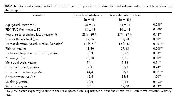 Mean age in the group with persistent obstruction (Table 4) was higher than that observed in the remaining patients, as was disease duration. In relation to aggravating factors, previous smoking was reported by 18% of the patients with persistent obstruction and by 5% of those with reversible obstruction (p = 0.052). The rate of bronchodilator response was similar between groups, and the presence of allergic rhinitis was less frequent in the group with persistent obstruction. The classification of initial severity was similar between groups, as was the treatment prescribed. Despite persistent obstruction, there were no differences between groups in relation to the control obtained in the final post-treatment evaluation.
