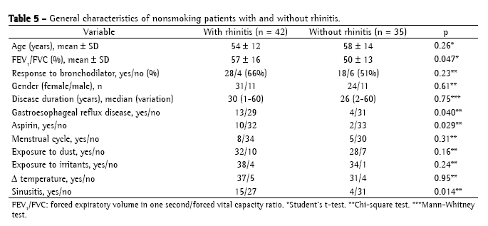Regarding persistent airway obstruction, we observed longer duration of the disease and lower atopy level, suggested by the lower frequency of rhinitis in these patients, as seen in the literature.(11)