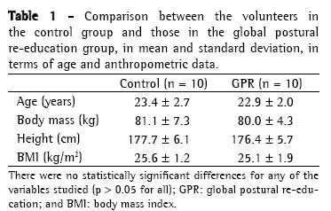 The study included 20 male volunteers with a sedentary lifestyle and presenting low aerobic capacity, according to the American Heart Association system of classification, which specifies a maximal oxygen uptake of 30.2 ±4.3 mL/kg/min. All of the volunteers were nonsmokers and presented similar anthropometric characteristics (Table 1). According to previous clinical evaluations, none of these individuals had any history of musculoskeletal, cardiovascular or respiratory disease. Each of the volunteers was submitted to a complete physical therapy evaluation, including the postural evaluation recommended by Souchard and Ollier,(7) which requires that the shortening of a given muscle group be determined qualitatively. This evaluation includes the following elements: 'Photograph', 'Interview', 'Examination of retractions', 'Re education' and 'Result'.