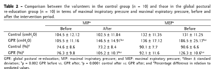 Table 2 shows that, in the control group, the pre-intervention absolute and relative values of MIP and MEP in relation to the predicted values did not differ significantly from those obtained after the intervention. For the GPR group, these values were significantly higher after the intervention.