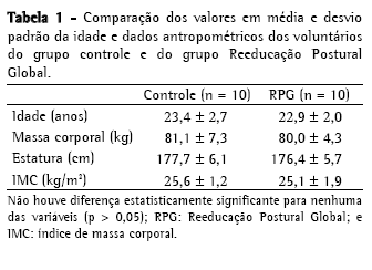 Participaram do estudo vinte voluntários do sexo masculino, sedentários, com capacidade aeróbia considerada fraca, segundo a classificação da American Heart Association, ou seja, consumo máximo de oxigênio (VO2máx) de 30,2 ± 4,3 mL/kg/min, não tabagistas, de antropometria semelhante (Tabela 1), sem antecedentes de doenças músculo-esqueléticas, cardiovasculares e respiratórias, conforme avaliação clínica prévia. Foi realizada avaliação fisioterapêutica completa, incluindo a avaliação postural preconizada por Souchard e Ollier,(7) que define que o encurtamento de determinada cadeia muscular seja verificado qualitativamente. Essa avaliação inclui: 'Foto', 'Interrogatório', 'Exame de retrações', 'Reequilibração' e 'Resultado'.