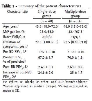 A total of 97 patients were included. Of those 97 patients, 23 were excluded: 15 because they were ineligible; 5 because they experienced treatment failure (3 cases in the multiple-dose group and 2 cases in the single-dose group); and 3 because they were lost to follow-up. Therefore, the number of patients who completed the treatment (evaluable population) was 74 (40 in the single-dose group and 34 in the multiple-dose group). All randomized patients who received at least one dose of medication were considered in the tolerability analysis. The two treatment groups were comparable regarding baseline demographic and asthma-related characteristics (Table 1).