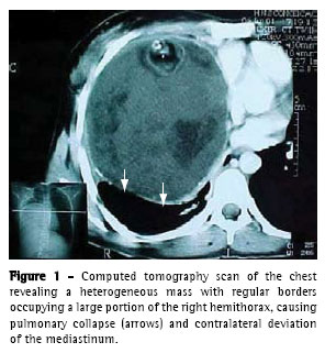 de evolução arrastada. O radiograma de tórax revelou opacidade quase total do hemitórax direito, levando à suspeita de derrame pleural. A tomografia de tórax evidenciou coleção pleural heterogênea, de contornos regulares (10,1 x 11,7 cm), nos dois terços inferiores do hemitórax direito, sem envolvimento de estruturas adjacentes. Na toracotomia exploradora, pela hipótese de teratoma cístico benigno do mediastino, realizou-se ressecção total da lesão, com boa evolução pós-operatória. A apresentação atípica e grande crescimento do tumor dificultaram