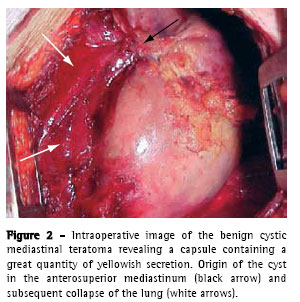 Introduction Mediastinal teratomas are rare occurrences and account for 8-13% of all mediastinal tumors. Teratomas primarily occur in the anterior mediastinum and affect young adults.(1,2) Mediastinal teratomas originate from pluripotent germ cells and comprise a wide variety of tissues originating from the three embryonic layers.(2,3)They may contain several types of tissues, such as epithelial and muscle tissues, as well as cartilage, and even teeth. Benign teratomas usually grow slowly and are asymptomatic for long periods or present minimal symptoms, which are very often disregarded not only by the patient but also by the physician. They are frequently detected on routine chest X rays. In general, they appear as well circumscribed masses and are usually excised without much difficulty.(2-4)