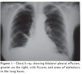 The chylothorax symptoms are nonspecific(11) and are related to the presence of liquid in the thoracic cavity, generating dyspnea, fatigue and thoracic discomfort on the affected side. Fever and pleuritic pain are rare because the chyle is not irritating to the pleural surface.(1) In general, the clinical profile appears two to ten days after the establishment of the lesion. The loss of chyle might result in hyponatremia, hypocalcemia, acidosis, hypovolemia, reduction of the venous return to the heart, and lymphocyte depletion.(6) In chronic profiles, weight loss and immunological impairment can occur.(8) In the case reported, the only patient complaints were generalized edema and mild difficulty in breathing.