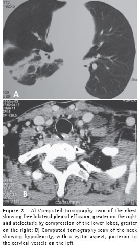 A previously healthy, 63-year-old female who was a nonsmoker and homemaker presented with swelling of the neck, anterior chest wall, abdomen and lower limbs. This was accompanied by discrete dyspnea upon exertion. The symptoms began after light physical activity at a fitness center five days prior. She reported no previous pulmonary disease and was taking 20 mg of fluoxetine per day, 3 mg of bromazepam per day, and regular female hormone replacement. Upon clinical examination, a discrete increase in volume was observed in the left supraclavicular fossa and in the right lateral neck wall. We also observed a diffuse decrease in breath sounds and in vocal fremitus in the lung bases (greater on the right than on the left), as well as edema in the anterior abdominal wall (grade 1) and in the lower limbs (grade 4).We requested the following tests: blood workup, coagulation profile, blood glucose, creatinine, urea, erythrocyte dissemination, total cholesterol, HDL, triglycerides, triiodothyronine, thyroxine, thyroid-stimulating hormone, and partial urinalysis, all of which presented normal results, ruling out dyslipidemia, coagulopathy, infection, nephropathy and hypothyroidism. Radiological evaluation of the thorax revealed slight bilateral pleural effusion (Figure 1), which was confirmed through a computed tomography scan of the chest (Figure 2A). This was complemented with tomography slices acquired at the neck level, revealing edema in the left supraclavicular region with hypodensity (20 × 10 mm) adjacent to the neurovascular bundle of the neck (Figure 2B).