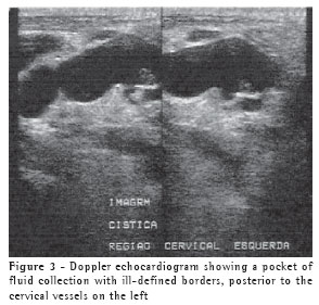 Ultrasound imaging of the cervical region showed the formation of a pocket of cystic fluid collection, posterior to the cervical vessels, suggesting rupture of the left jugular trunk. It also demonstrated a slight increase in the thickness of the left sternocleidomastoid muscle, suggesting an inflammatory process secondary to muscle distention (Figure 3). The patient was submitted to diagnostic thoracentesis on the right side, and the opaque liquid obtained was consistent with chylothorax.