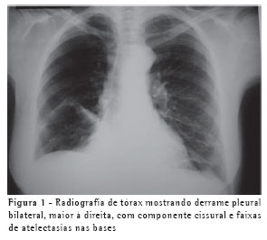 Os sintomas do QT são inespecíficos(11) e estão relacionados à presença de líquido na cavidade torácica, gerando dispnéia, fadiga e desconforto torácico no lado afetado. Febre e dor pleurítica são raras porque o quilo não é irritante da superfície pleural.(1) Em geral, o quadro clínico aparece dois a dez dias após o estabelecimento da lesão. A perda do quilo pode resultar em hiponatremia, hipocalcemia, acidose, hipovolemia, diminuição do retorno venoso ao coração e depleção de linfócitos.(6) Em quadros crônicos podem ocorrer emagrecimento e comprometimento imunológico.(8) No caso relatado, as únicas queixas da paciente eram edema generalizado e leve dificuldade respiratória.