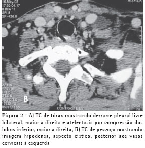 Uma mulher de 63 anos, do lar, não tabagista, previamente hígida, apresentou-se com queixa de aumento de volume em pescoço, face anterior do tórax, abdome e membros inferiores. Havia associação com dispnéia discreta aos esforços. O quadro teve início após atividade física leve em academia de ginástica, havia cinco dias. Negava doença pulmonar prévia e referia uso de fluoxetina a 20 mg/dia, bromazepam a 3 mg/dia e reposição hormonal feminina regular. Ao exame clínico observou-se um discreto aumento de volume em fossa supraclavicular esquerda e face lateral direita do pescoço. Observou-se ainda diminuição do murmúrio vesicular de forma difusa e de frêmito toracovocal em bases (direito maior que esquerdo), além de edema de parede abdominal anterior e de membros inferiores (grau I/IV). Foram solicitados hemograma, coagulograma, glicemia, creatinina, uréia, velocidade de hemossedimentação, colesterol total, HDL, triglicerídeos, T3, T4, TSH e parcial de urina, os quais se apresentaram todos normais, descartando a presença de dislipidemia, coagulopatia, infecção, nefropatia e hipotireoidismo. A avaliação radiológica do tórax revelou um pequeno derrame pleural bilateral (Figura 1), confirmado pela tomografia axial computadorizada de tórax (Figura 2A). Esta foi complementada com cortes ao nível do pescoço, que evidenciaram edema na região supraclavicular esquerda com imagem hipodensa (20 x 10 mm) adjacente ao feixe vasculonervoso do pescoço (Figura 2B). A ultra-sonografia da região cervical mostrou a formação de uma coleção cística, posteriormente aos vasos cervicais, sugestiva da ruptura do tronco jugular esquerdo. Demonstrou ainda um pequeno aumento da espessura do músculo esternocleidomastóideo esquerdo, sugestivo de processo inflamatório secundário a distensão muscular (Figura 3). A paciente foi submetida a toracocentese diagnóstica à direita com obtenção de líquido leitoso compatível com QT. A análise laboratorial demonstrou tratar-se de um exsudato com predomínio de polimorfonucleares e com dosagem de triglicerídeos de 2.035 mg/dl, colesterol de 131 mg/dl e proteínas de 9,7 g/dl, confirmando o quadro laboratorial de QT. Foram realizadas citologia oncótica, bacterioscopia de Ziehl, micológico direto e culturas, que resultaram negativos, descartando processos malignos e doenças infecciosas.